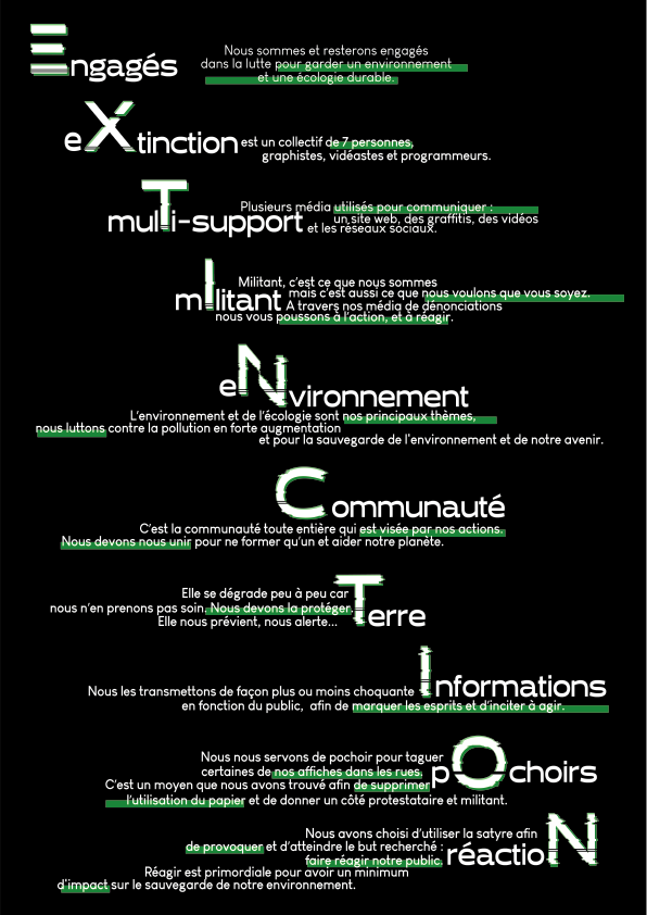 Extinction est une instance médiatique multi-support luttant pour l'écologie et la sauvegarde de la planète.